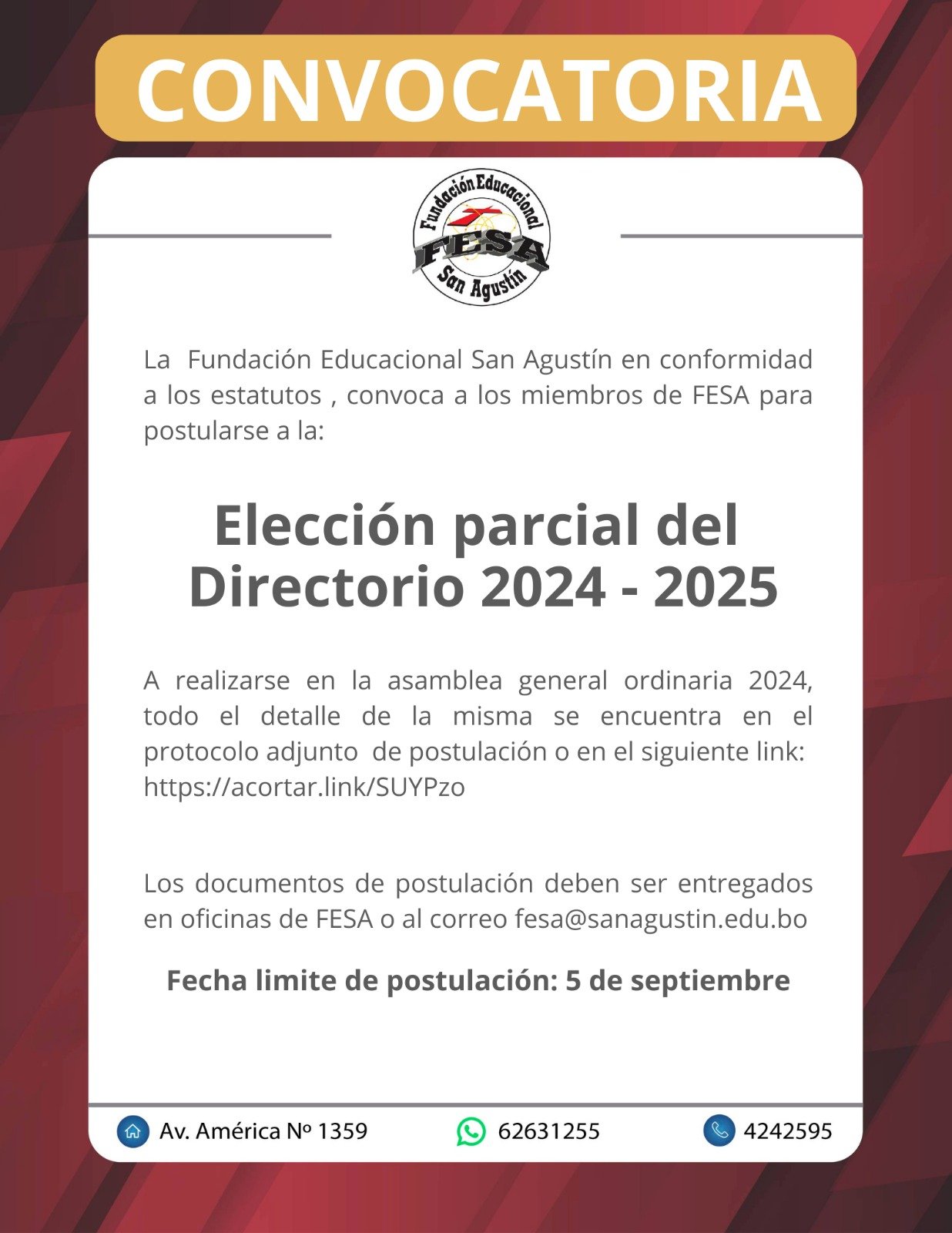 La Fundación Educacional San Agustín invita a todos los miembros de FESA a postularse para la Elección Parcial del Directorio 2024 - 2025. 🗳️